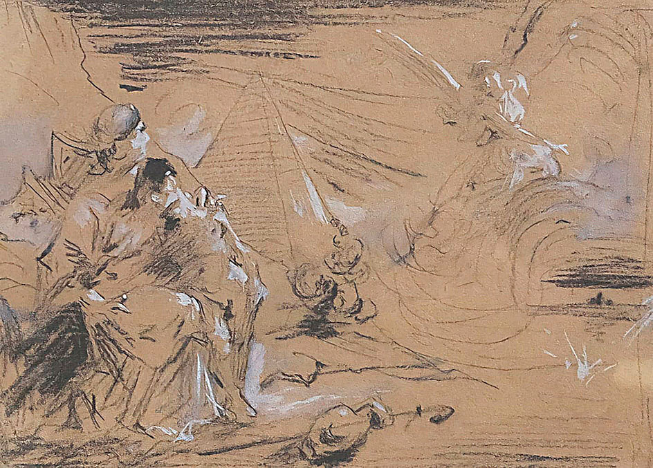 Matita carboncino e biacca su carta azzurra