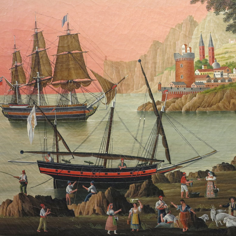 Particolare di uno di due dipinti di Marina ad olio su tela di Scuola Napoletana, raffiguranti una scena portuale ed un mare in tempesta. Le navi presentano bandiere inglesi, francesi e della Real Marina del Regno delle Due Sicilie.