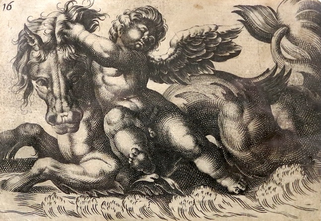 (attivo tra il 1580 e il 1610). "Putto e Pistrice". Bulino e acquaforte, 1608 ca.