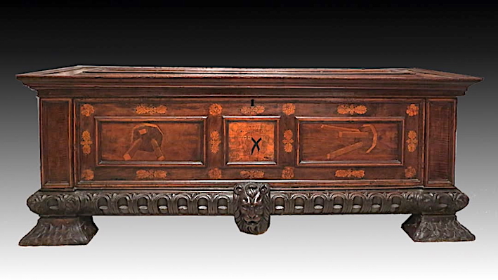 Cassone in noce con al centro con uno stemma araldico partito delle famiglie Malvasia, e Lombardi.