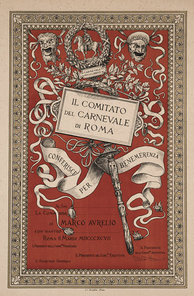 "Manifesto del Comitato del Carnevale di Roma" firmato dal Presidente della Commissione Artistica Attilio Simonetti. Cromolitografia datata 11 marzo 1897.